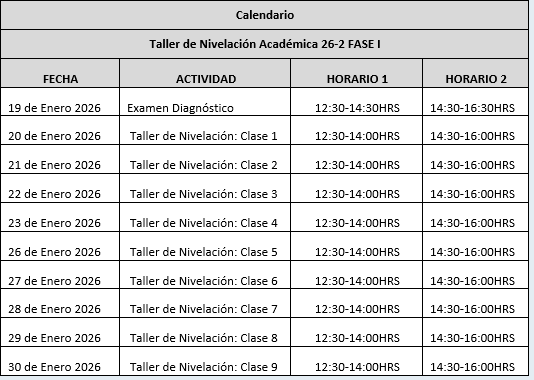 Presencial El objetivo de este examen diagnóstico es conocer el nivel general de conocimientos básicos de matemáticas con el que inician los alumnos de nuevo ingreso el semestre, para identificar fortalezas y áreas de oportunidad. Los resultados nos permitirán orientar mejor las actividades de apoyo del Taller de Nivelación Académica 26-2 para fortalecer los conocimientos, tanto en la Fase I como en la Fase II. Este examen es de carácter informativo. A continuación enlistamos material necesario para presentar el Examen Diagnóstico el 19 de Enero del 2025: • Hojas blancas • Lápiz • Goma • Bolígrafo Consulta el salón aquí (se habilitará enlace)