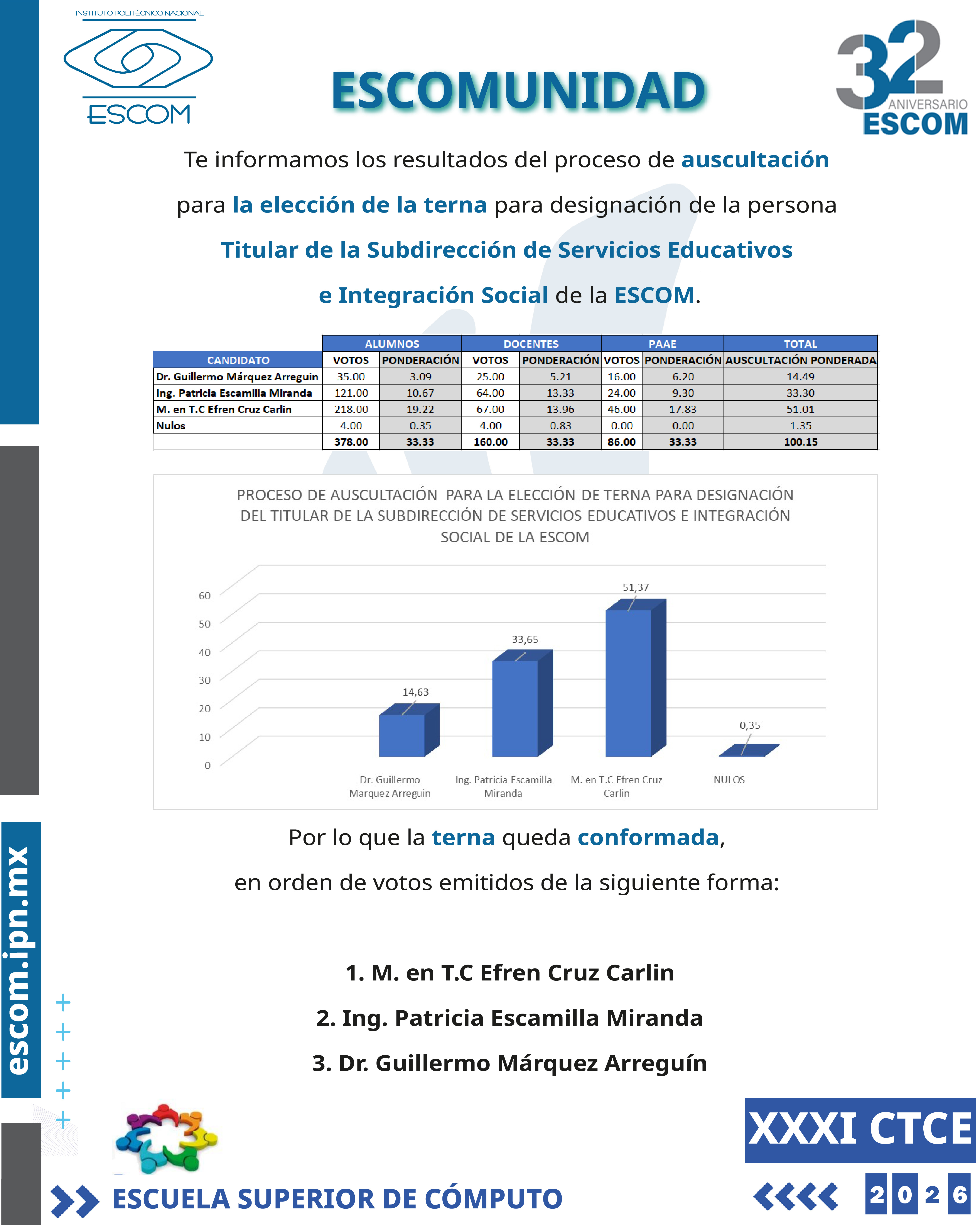 El Consejo Técnico Consultivo Escolar de la Escuela Superior de Cómputo, convoca a los miembros de la Comunidad Politecnica a participar en el proceso de elección de terna, de la cual se designará a la persona titular de la Subdirección de Servicios Educativos e Integración Social de nuestra unidad académica, bajo las siguientes bases: