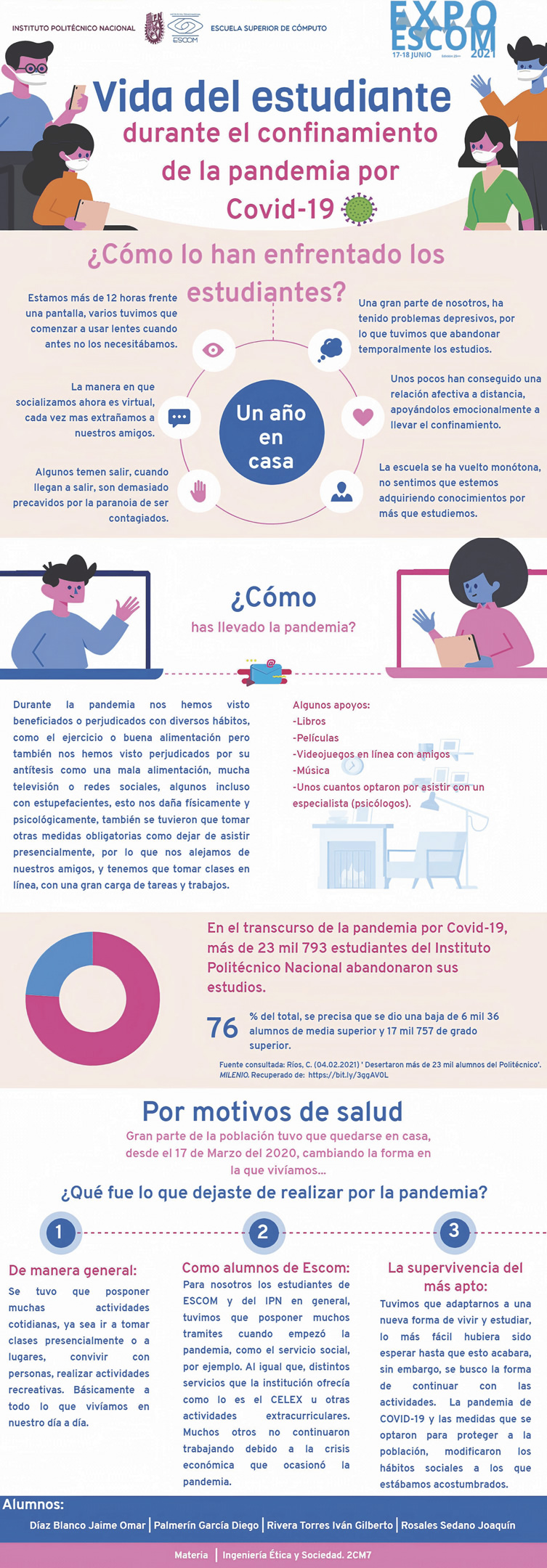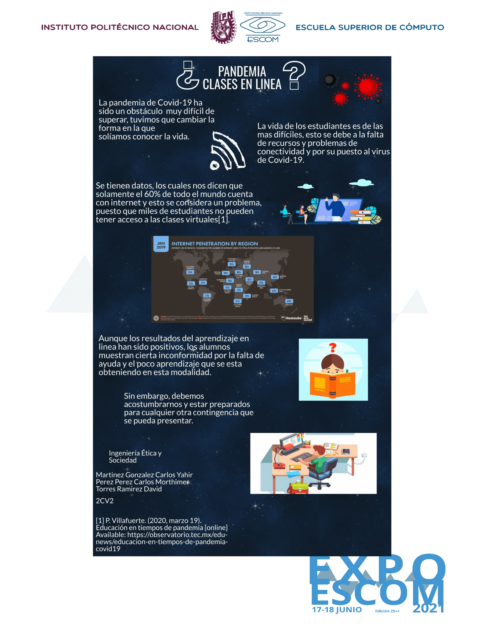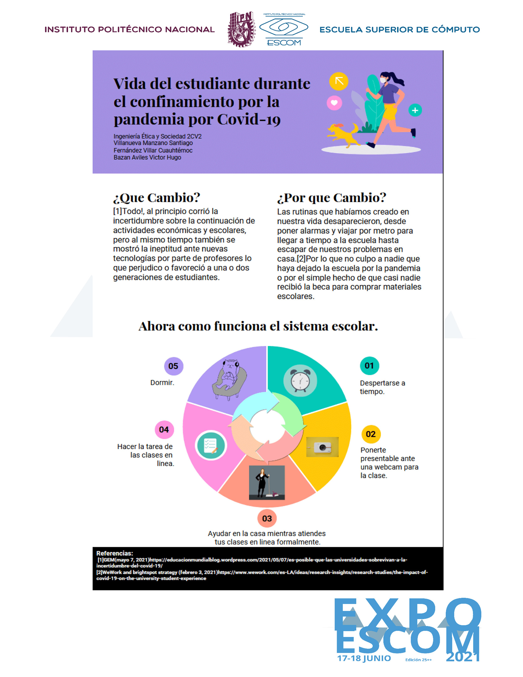 Así, en el marco de la Expo-ESCOM 2021, la Academia de Ciencias Sociales, ha organizado dos actividades que tienen como propósito que nuestros alumnos expresen su experiencia en lo académico, familiar y personal, sus obstáculos, y peripecias como parte del tránsito abrupto del aula de clases al confinamiento en casa, cuyo efecto, y con ello, perder de la noche a la mañana sus actividades cotidianas, sus espacios de convivencia, su vida como la tenían entendida.